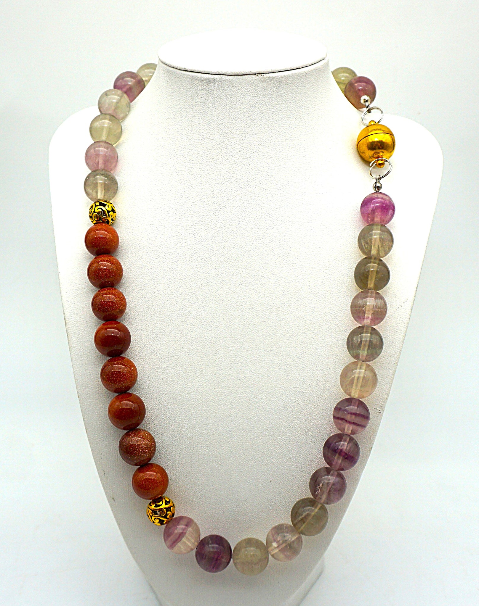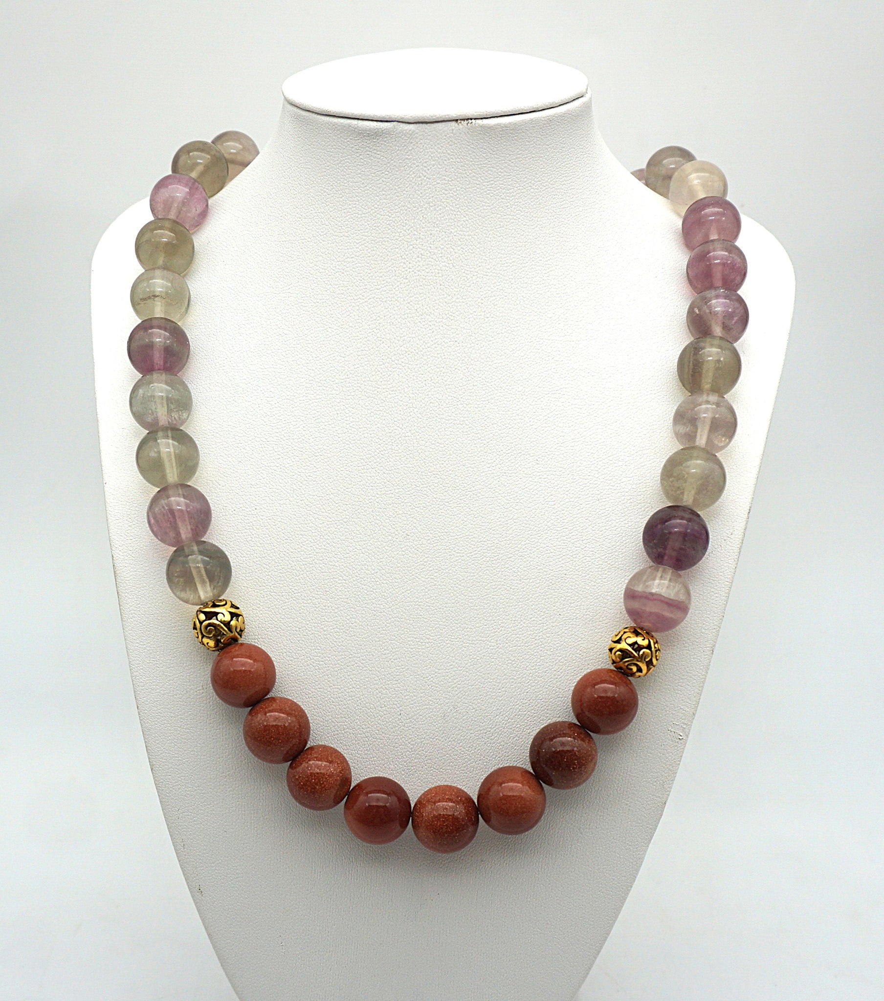 DM der Kugeln: Fluorit 14 mm, Goldfluss 14 mm. (Goldfluss ist künstlich hergestellt)