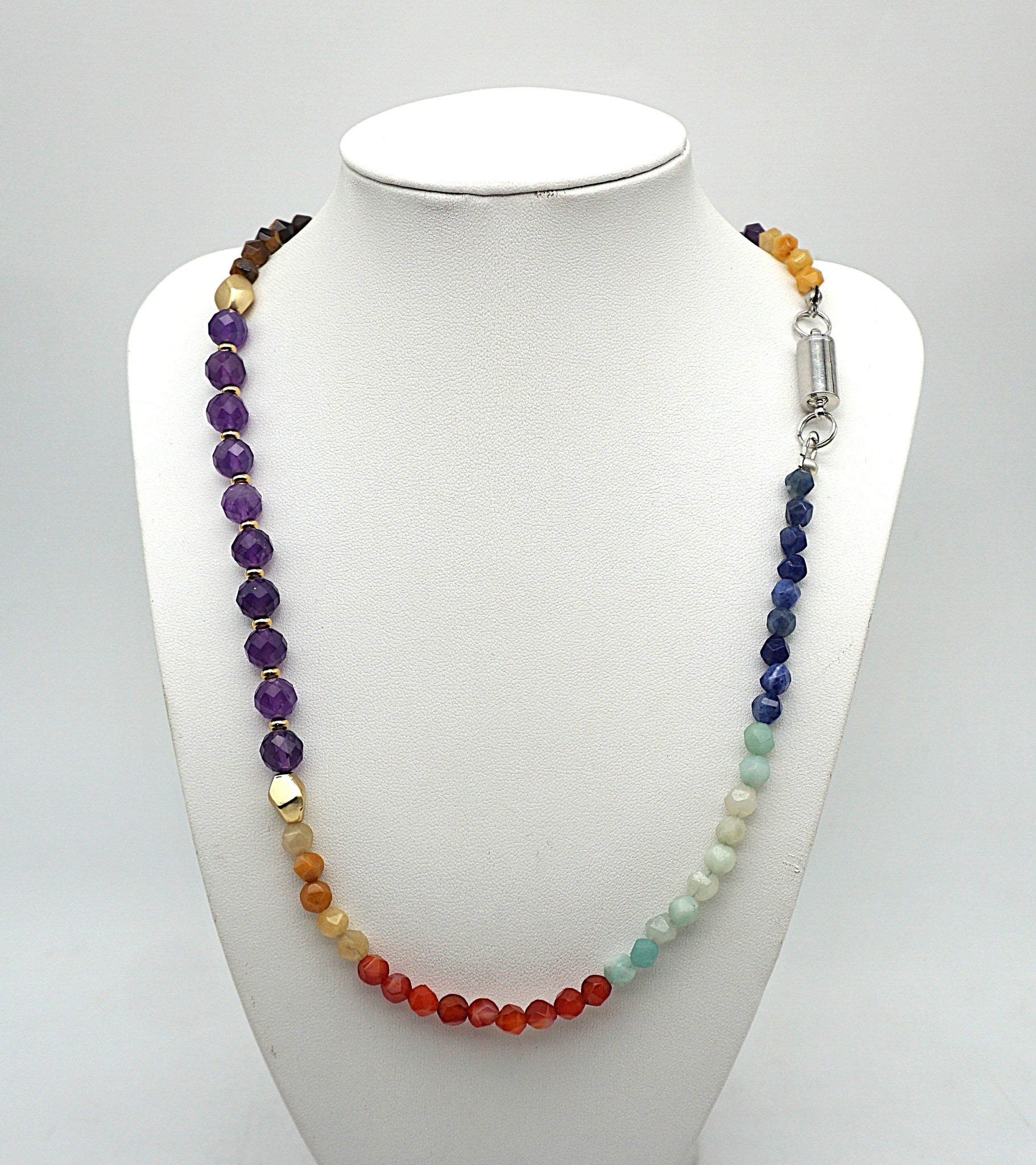 Eine Top Halskette mit Sodalith, Karneol, Amethyst, Tigerauge, Rosenquarz, Achat, facettiert